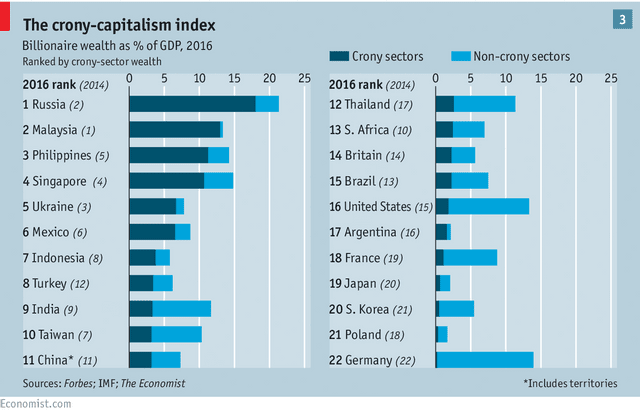 a „crony capitalism” néven elterjedt rendszerről van szó, ahol az üzleti és a politikai szféra többé-kevésbé szorosan összefonódik, egymás pozíciójának védelmében korlátozzák a versenyt és fosztogatják a közjavakat, elsajátítják az országban keletkező jövedelmeket.