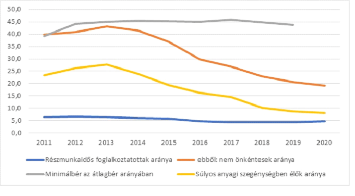 Az alábbi ábrán az látszik, hogy a magyar minimálbér a 2012. évi emelés után stabilan az átlagbér 45%-a körül maradt a koronajárványig. A részmunkaidős foglalkoztatás is elég stabilan 5%-on mozgott. Ami viszont igencsak figyelemre méltó: ez alatt az évtized alatt jelentősen és szinte azonos ütemben csökkent azok aránya, akik kényszerből voltak részmunkaidős foglalkoztatottak, és azoké a háztartásoké, amelyek súlyos anyagi nélkülözésben élnek (ez a nemeztközi sztenderdek szerint legalább 4 tényező hiányát jelenti egy tíztényezős listáról).