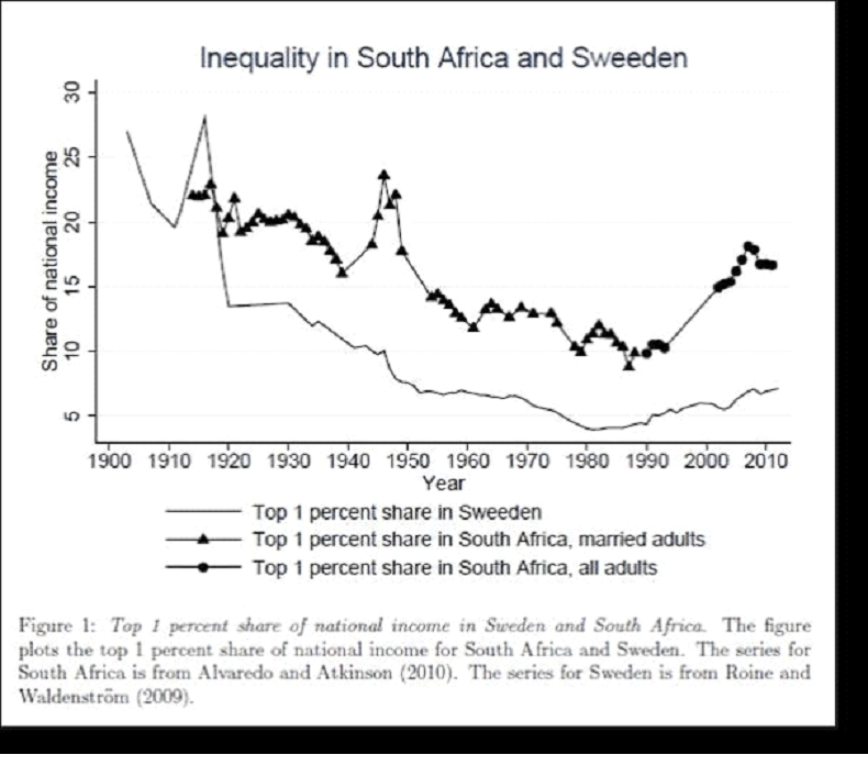 A mese a legmagasabb jövedelmű 1% nemzeti jövedelemből való részesedését hasonlítja össze Svédországban és Dél-Afrikában. Svédországban a század elején ez magasabb volt, mint Dél-Afrikában, majd az első világháborút követően gyorsan esett. Az újabb emelkedés Svédországban hamarabb kezdődött, mint a Dél-Afrikában. De lényegében a top 1% részesedése nagyjából hasonlóan viselkedett mindkét országban, pedig a két ország társadalmi viszonyai igencsak eltértek a múlt század folyamán.