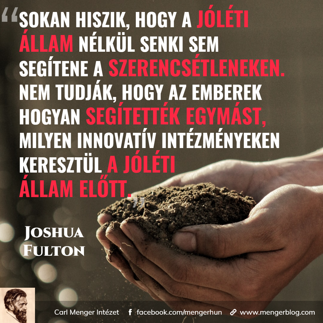 Kiterjedt szociális védőháló – állami segélyek vagy adakozás nélkül Sokan azt hiszik, hogy a jóléti állam nélkül a társadalom káoszba fulladna. Úgy vélik, hogy senki sem segítene a szerencsétleneken, az utcák pedig idővel lázadások színterévé válnának. Nem tudják, hogy az emberek milyen innovatív intézményeken keresztül segítették egymást a jóléti állam bevezetése előtt. Az egyik legfontosabb … Continue reading Joshua Fulton: Jóléti intézmények a jóléti állam előtt